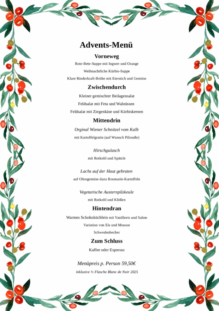 In der Adventszeit bieten wir Freitags und Samstags ab 17:00 Uhr ausschließlich Gerichte von der Adventsmenü-Sonderkarte an. Anmeldung ist unbedingt erforderlich!